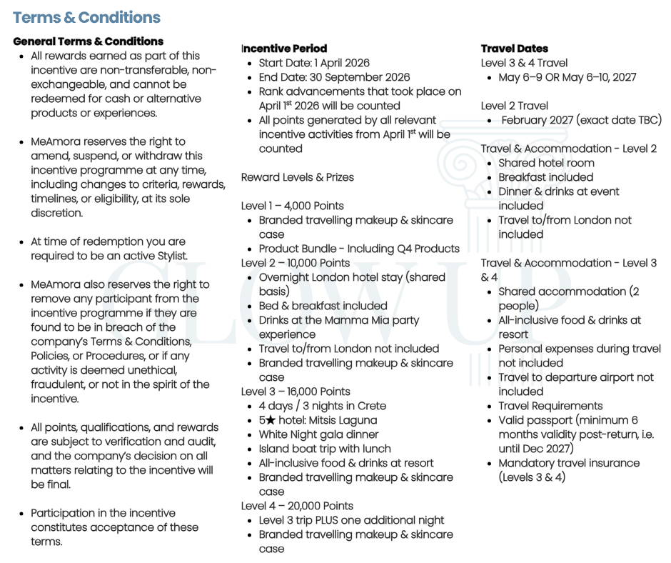 Ready to elevate your experience? Tier 2 unlocks an unforgettable night in London. Enjoy the magic of the Mamma Mia dining and dance experience, complete with an overnight stay. But it is more than just a night out. It is about sharing laughter, celebrating wins, and creating lasting memories alongside your fellow stylists. These moments, these connections, and these shared experiences are exactly what MeAmora is all about. Plus the MeAmora Beauty Case