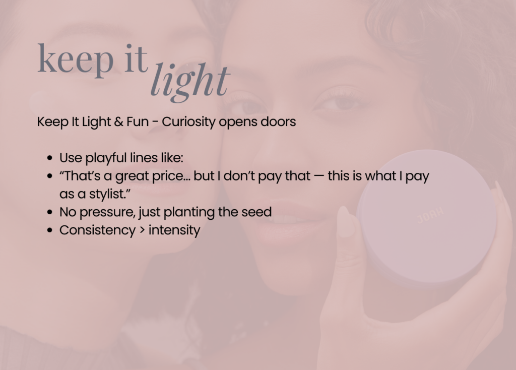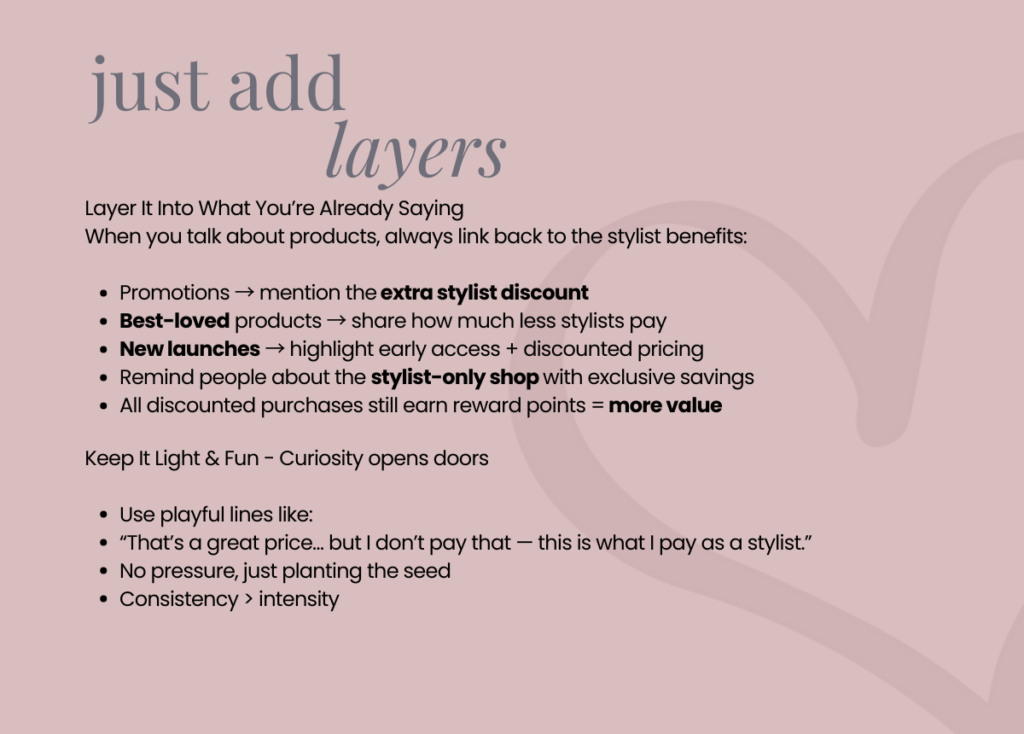 “Hey lovely, I just wanted to share this promotion with you because I know you love these products. It’s a great price as it is, but as a stylist I actually pay less because we get an extra discount and reward points on top. And if you ever wanted to share with friends or family, there’s also the option to earn weekly — totally optional. Have a look and let me know what you think, and I’ll check back in with you tomor