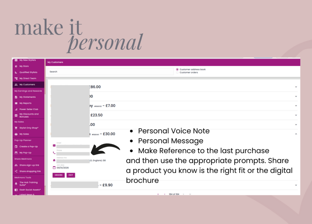 “Hi, quick one — our new MeAmora Beauty Book  has just launched and I wanted to share it with you. It’s a great way to browse the full range, so pop the kettle on and take a look. Also, your fave xxx is on page xxx as you love that, you may want to take a look at xxx too! – All Stylists get at least 20% off, and that ongoing discount or earning option could work for you too. Let me know what you think and I’ll follow up in a day or so.”
