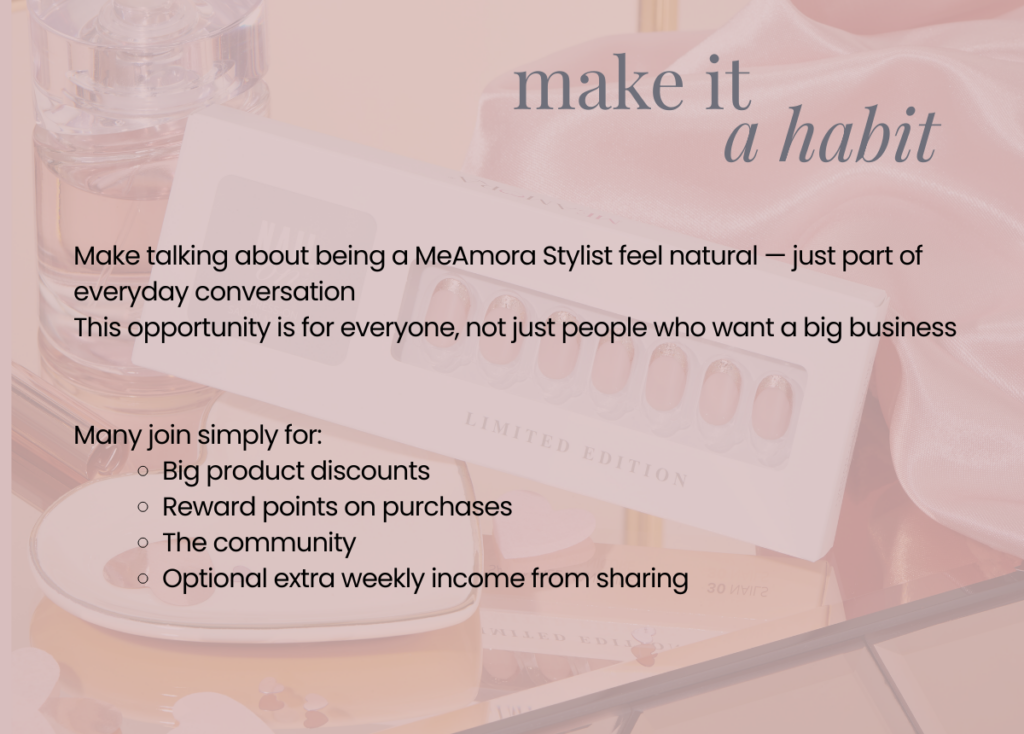 “Hi, quick message because this made me think of you. The main reason I love being a MeAmora stylist is just the discounts, early access, and the community. I don’t overcomplicate it at all — I just enjoy paying less for things I already use. Have a little look and tell me what you think, and I’ll follow up with you in the next day or so.”