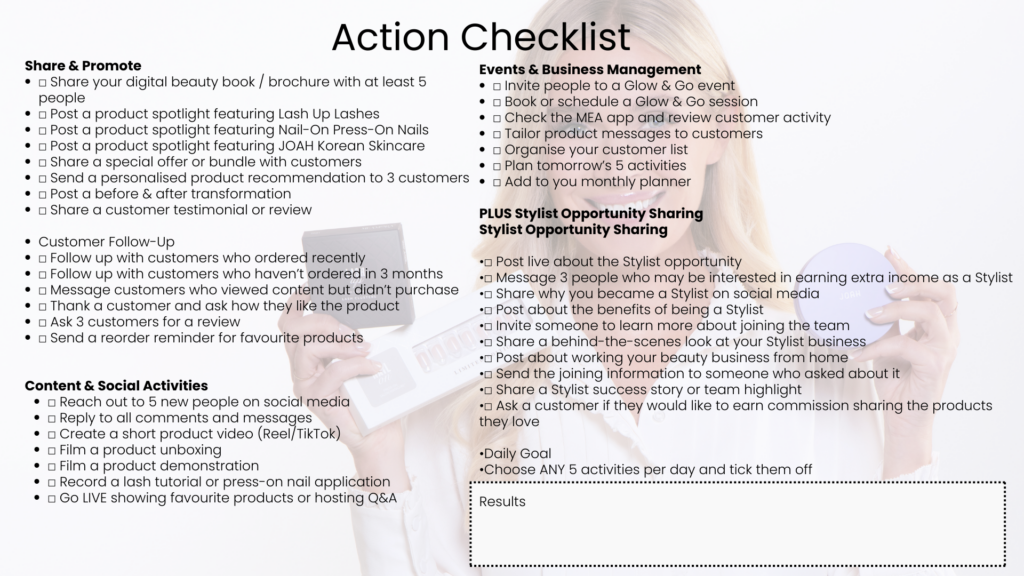 “Hey lovely, I’ve just sent you our new MeAmora Beauty Book — it’s gorgeous and full of all the products and inspiration. Grab a cuppa when you can and have a flick through. Just so you know, as a stylist I get a minimum of 20% off everything in there, and if you ever wanted the same discount or the option to earn weekly by sharing, that’s there too. Have a look and I’ll check back in with you soon or just shout if you have any questions or want so advice.”